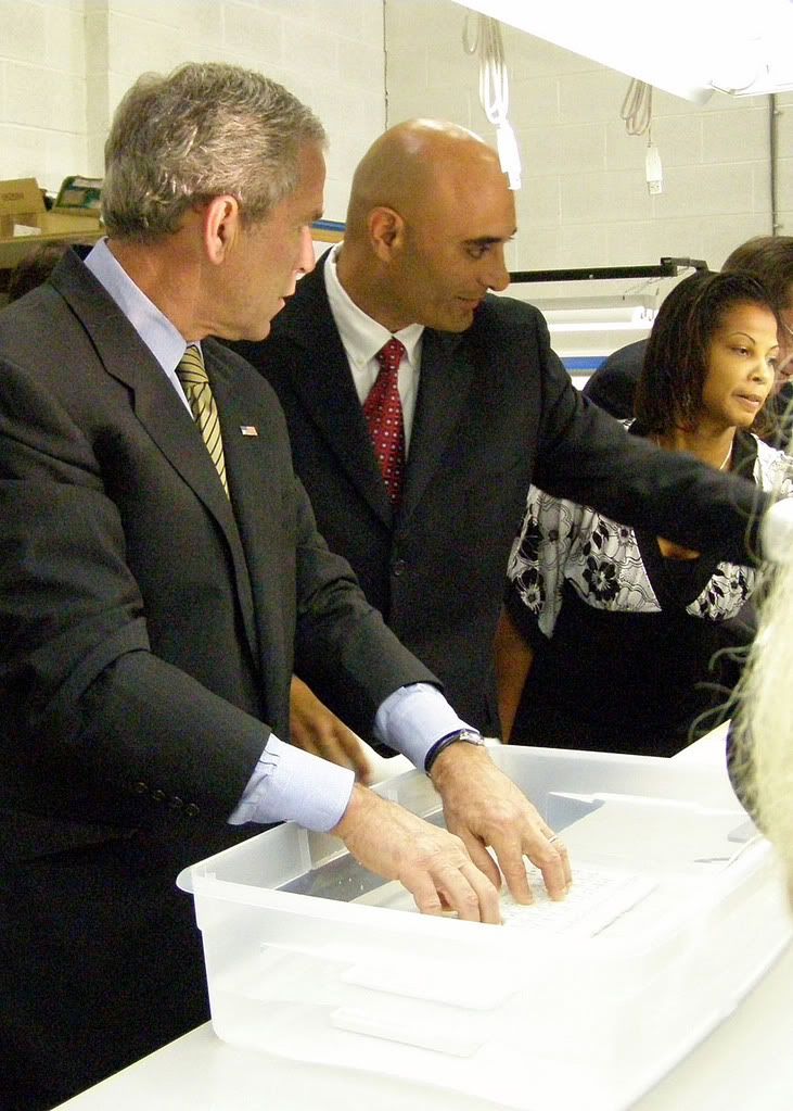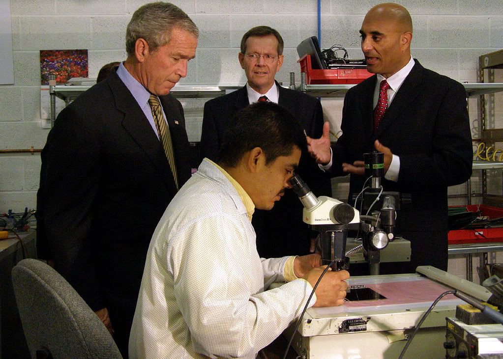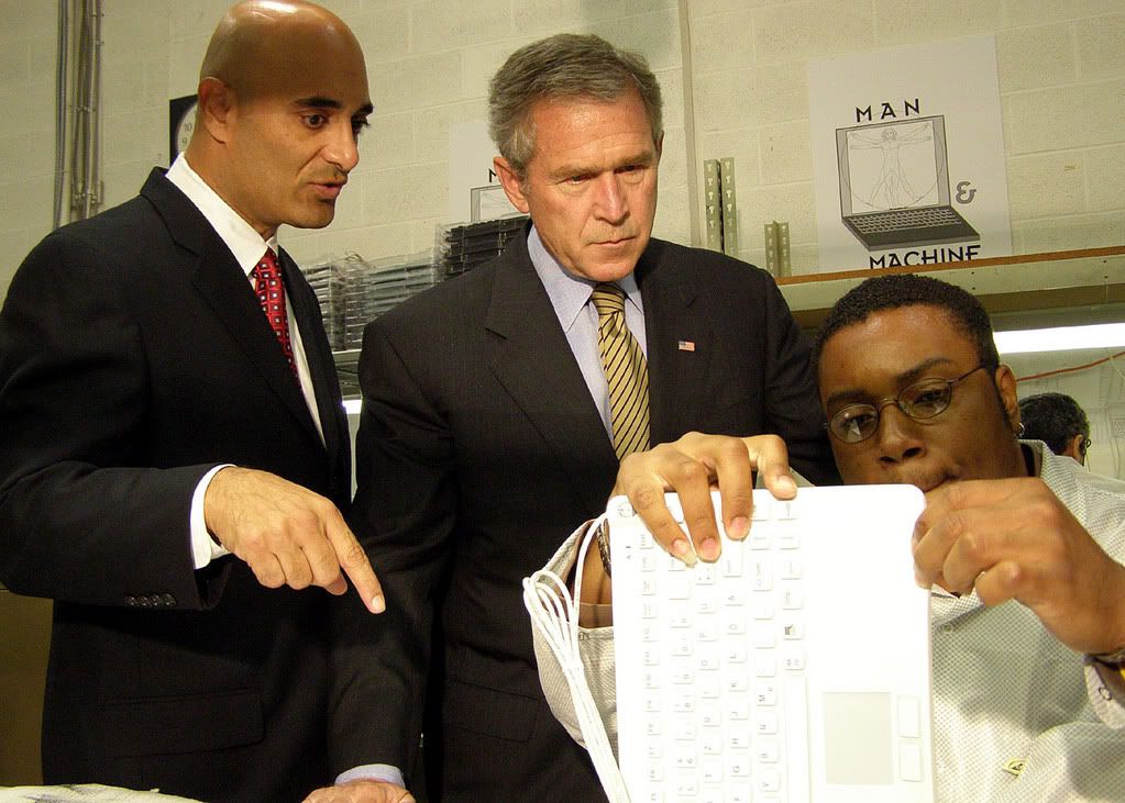President Bush and Man & Machine Big Cheese Clif Broumand watch Gelacio Cabrera repair an LCD.