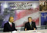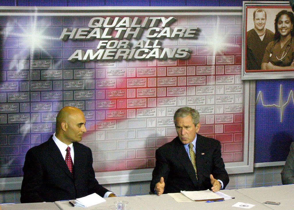President Bush and Clif Broumand talk during the roundtable on health insurance.