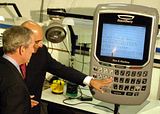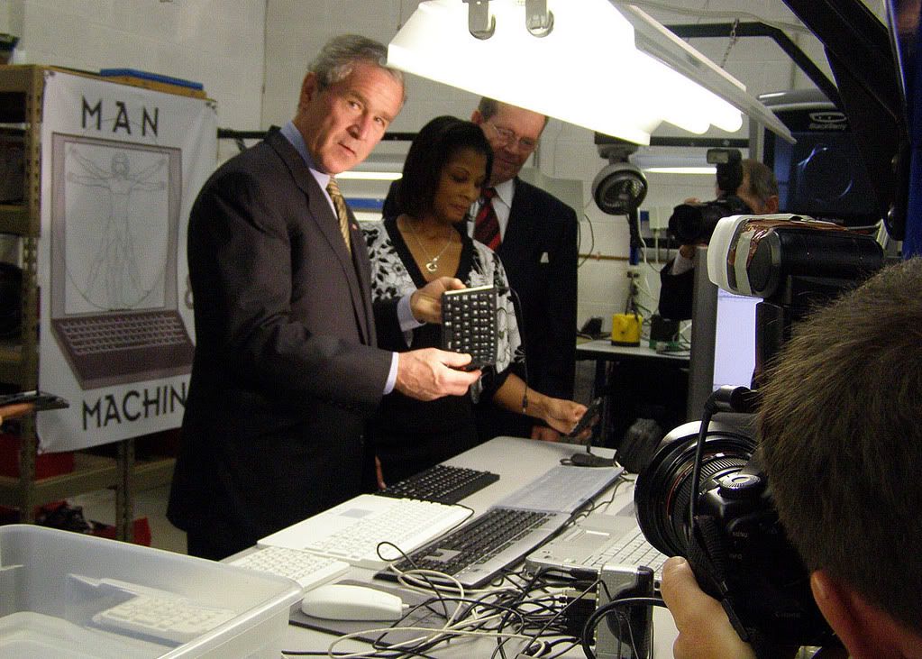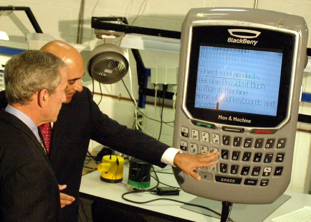 President Bush enjoys the flexibility of the CoolMIR, a foldable keyboard that can be attached to a Blackberry to make data entry and email writing much faster and easier than just using thumbs. Man & Machine employee Angela Williams looks on.