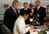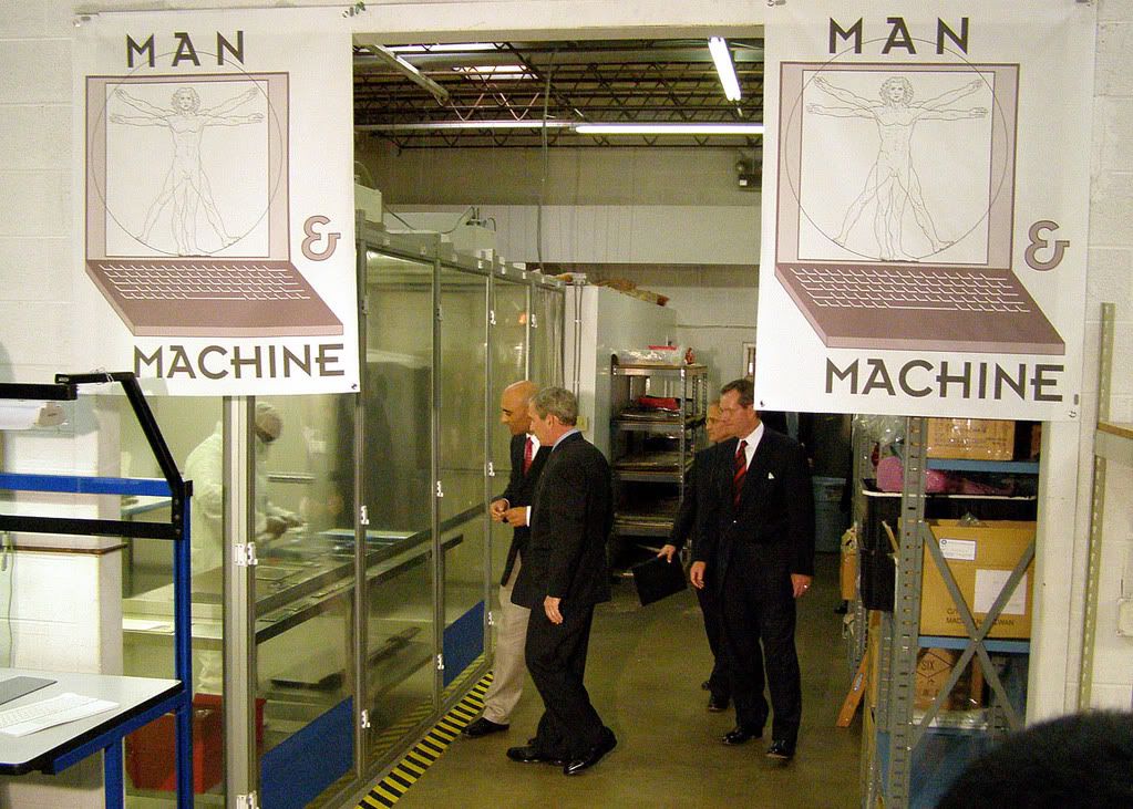 Here President Bush observes the Man & Machine cleanroom, where LCDs are enhanced.